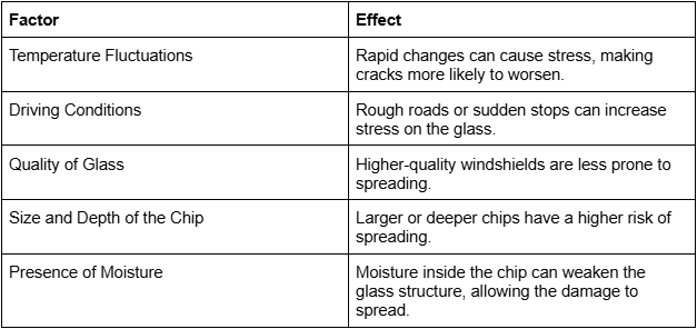 The short answer is yes — but it depends. Several factors influence whether a chip will develop into a larger crack. Temperature fluctuations, driving conditions, the quality of glass, the size and depth of the chip, and the presence or absence of moisture all play a role, as the table below describes.